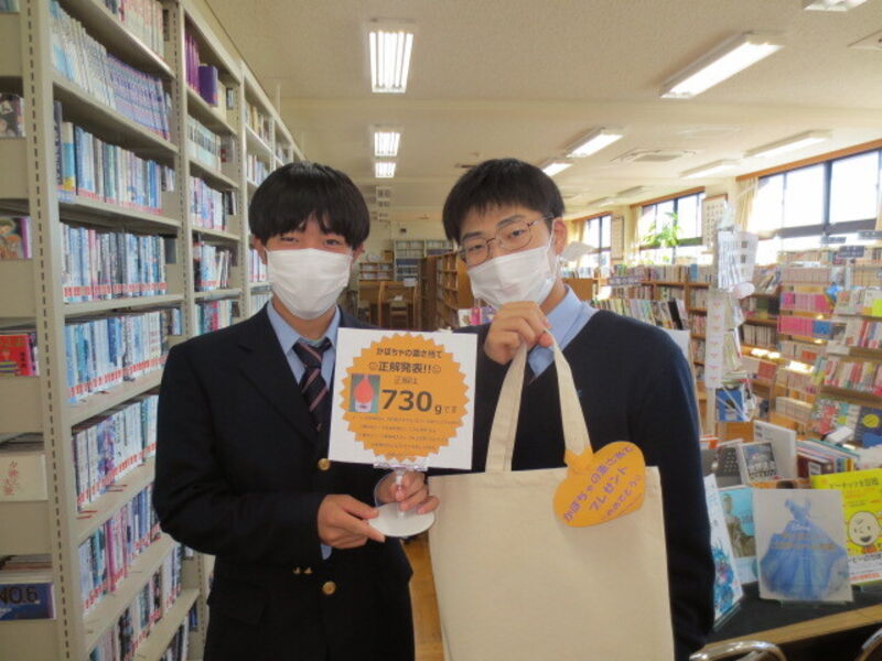 図書館では10月28日(金)までハロウィンイベントを行いました。 「クリアファイルプレゼント」や「カボチャの重さ当てチャレンジ」に多くの生徒が参加してくれました。 「カボチャの重さ当てチャレンジ」では、見事ピッタリ当てた生徒に記念品を贈りました。 本や図書館に触れる良い機会になったと思います。